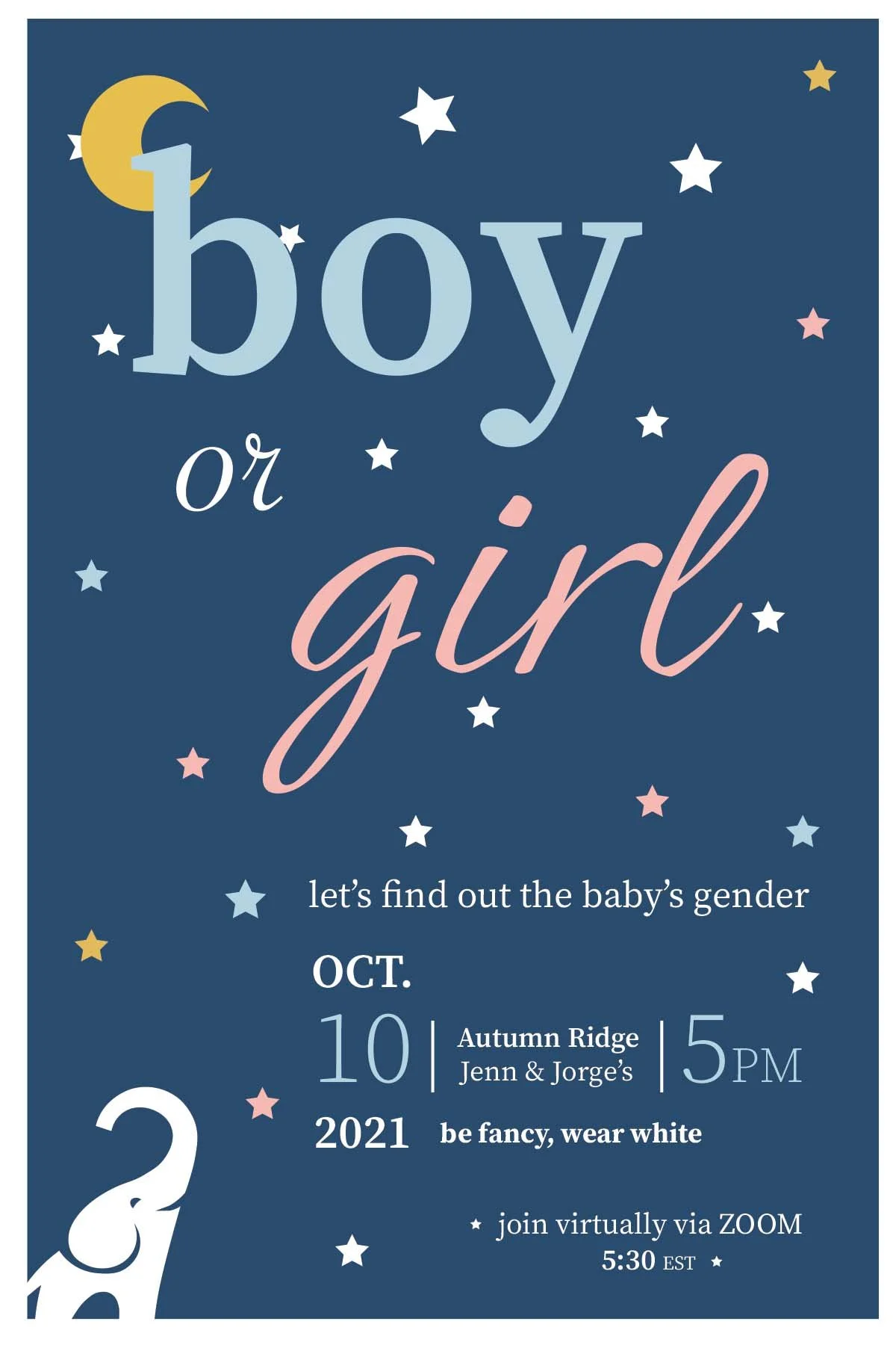 The design that I recreated was for an invitation to celebrate a baby's gender reveal. To recreate the invitation my client asked me to use blue and pink colors. To decored the invitation i used things that look unisex since the guests could not know the gender of the baby until the day of the party.
